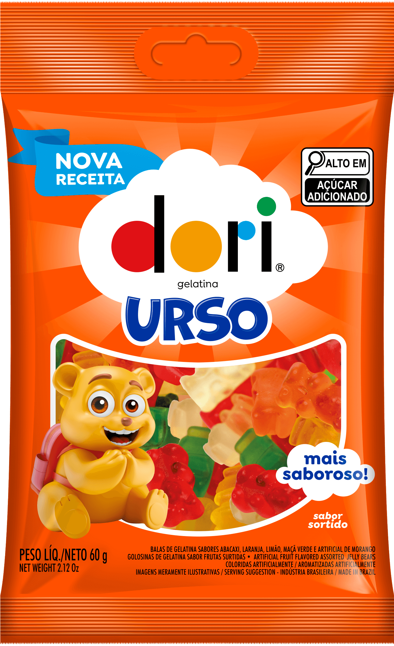 BALAS SORTIDAS DE GELATINA SABORES DE LARANJA, ABACAXI, LIMÃO E MAÇÃ E SABOR ARTIFICIAL DE MORANGO, COLORIDAS ARTIFICIALMENTE. INGREDIENTES: XAROPE DE GLICOSE, AÇÚCAR, DEXTROSE, GELATINA, ÓLEO VEGETAL, UMECTANTE SORBITOL, ACIDULANTE ÁCIDO CÍTRICO, AROMATIZANTES, GLACEANTE CERA DE CARNAÚBA E CORANTES ARTIFICIAIS VERMELHO ALLURA Ac, AMARELO TARTRAZINA, AMARELO CREPÚSCULO FCF E AZUL BRILHANTE FCF.