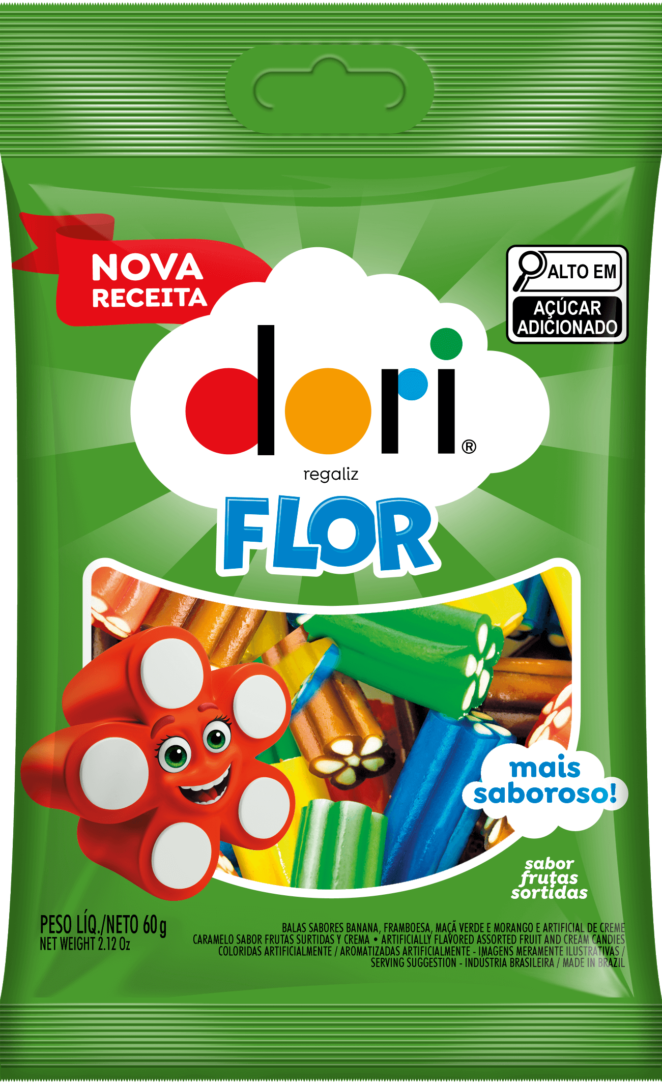 BALAS SABORES DE MAÇA VERDE, MORANGO E BANANA E SABORES ARTIFICIAIS DE FRAMBOESA E CREME, COLORIDAS ARTIFICIALMENTE. INGREDIENTES: AÇÚCAR, XAROPE DE MALTOSE, FARINHA DE TRIGO ENRIQUECIDA COM FERRO E ÁCIDO FÓLICO, AMIDO DE MILHO, DEXTROSE, GORDURA VEGETAL, GELATINA, ÓLEO VEGETAL, ACIDULANTE ÁCIDO CÍTRICO, UMECTANTE SORBITOL, AROMATIZANTES, EMULSIFICANTES MONO E DIGLICERÍDEOS DE ÁCIDOS GRAXOS E ÉSTERES DE MONO E DIGLICERÍDEOS DE ÁCIDOS GRAXOS COM ÁCIDO ACÉTICO, REGULADOR DE ACIDEZ CITRATO DE SÓDIO, GLACEANTES GOMA LACA E CERA DE CARNAÚBA, CORANTES ARTIFICIAIS AMARELO TARTRAZINA, VERMELHO 40, E AZUL BRILHANTE FCF.